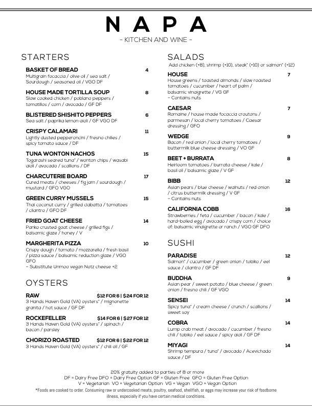 Welcome to NAPA Kitchen and Wine, an exquisite dining destination located in Midlothian, VA. Here, the menu shines with a diverse selection of mouthwatering dishes crafted to delight your palate. Guests rave about the smash burger, perfectly cooked and bursting with flavor, while the she crab soup and shrimp scampi risotto have received high praise for their rich tastes and comforting textures.